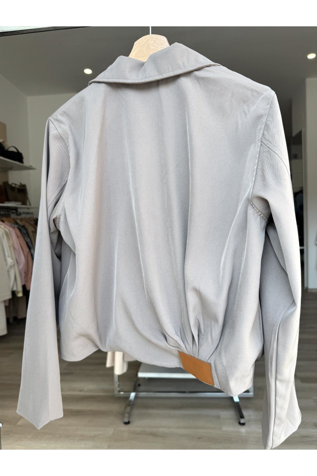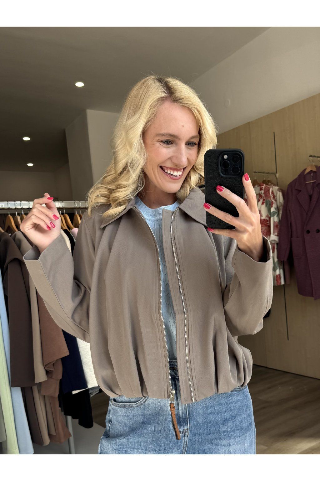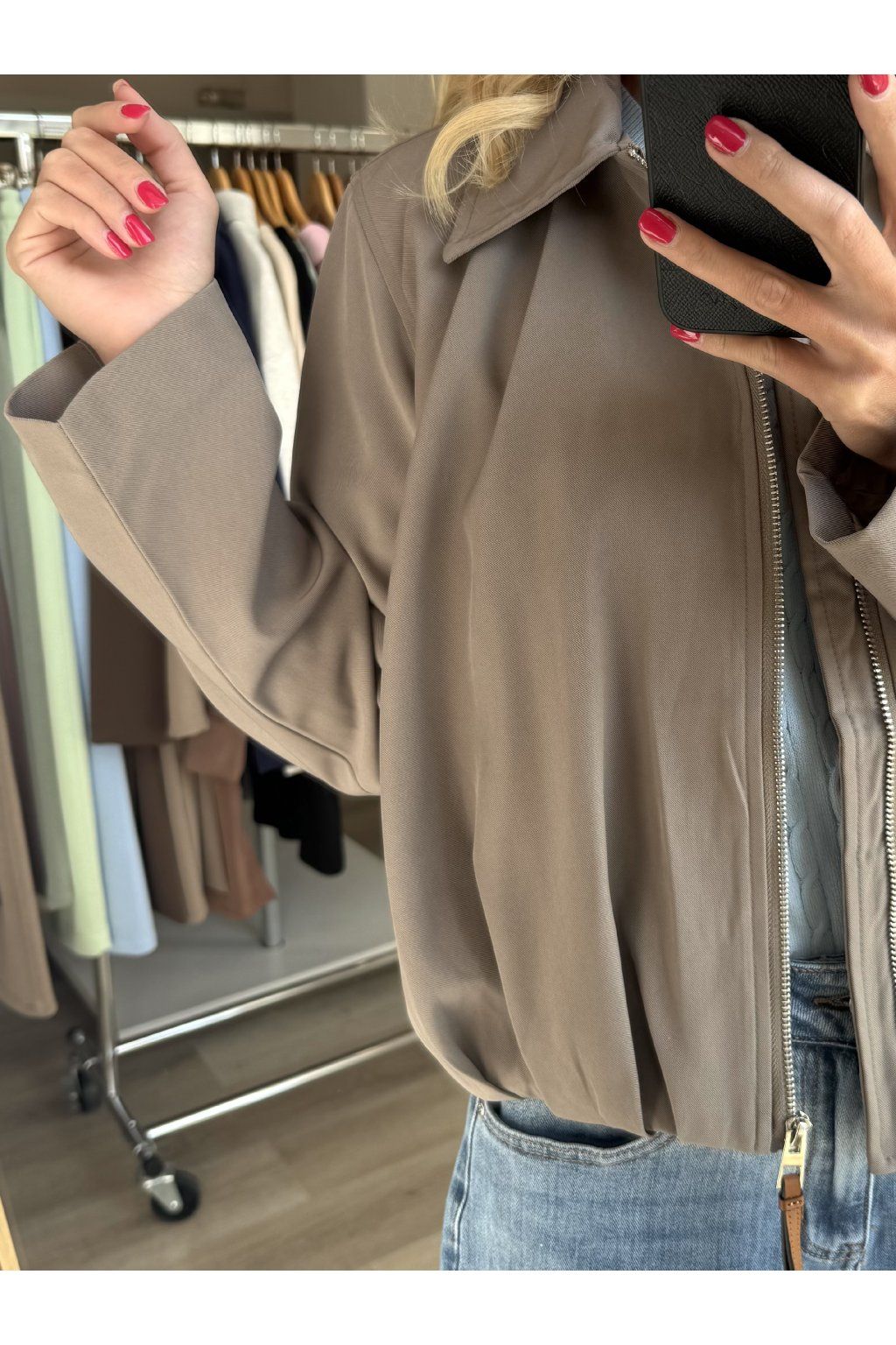 Stylová lehká bunda v neutrálním odstínu se zapínáním na zip a límečkem. Má volnější střih, který působí moderně a skvěle se kombinuje s džínami i elegantnějšími kousky. Ideální na každodenní nošení.