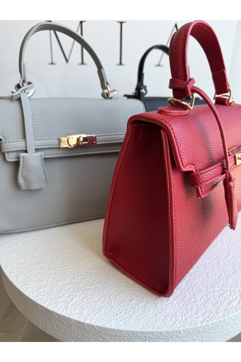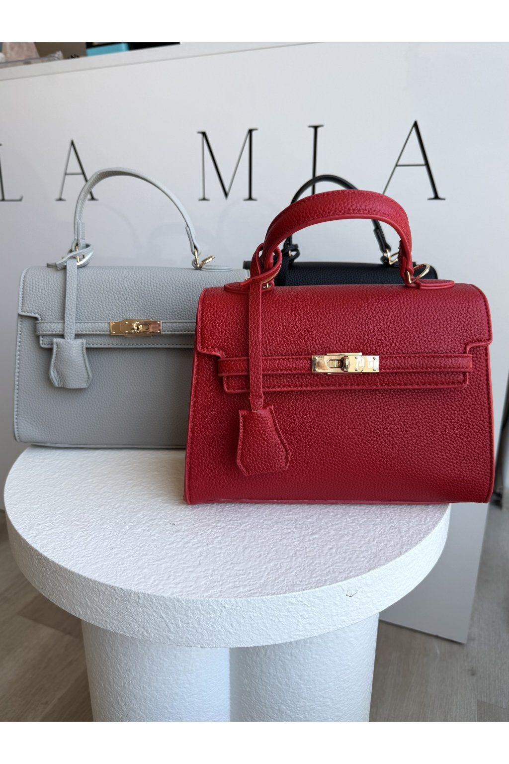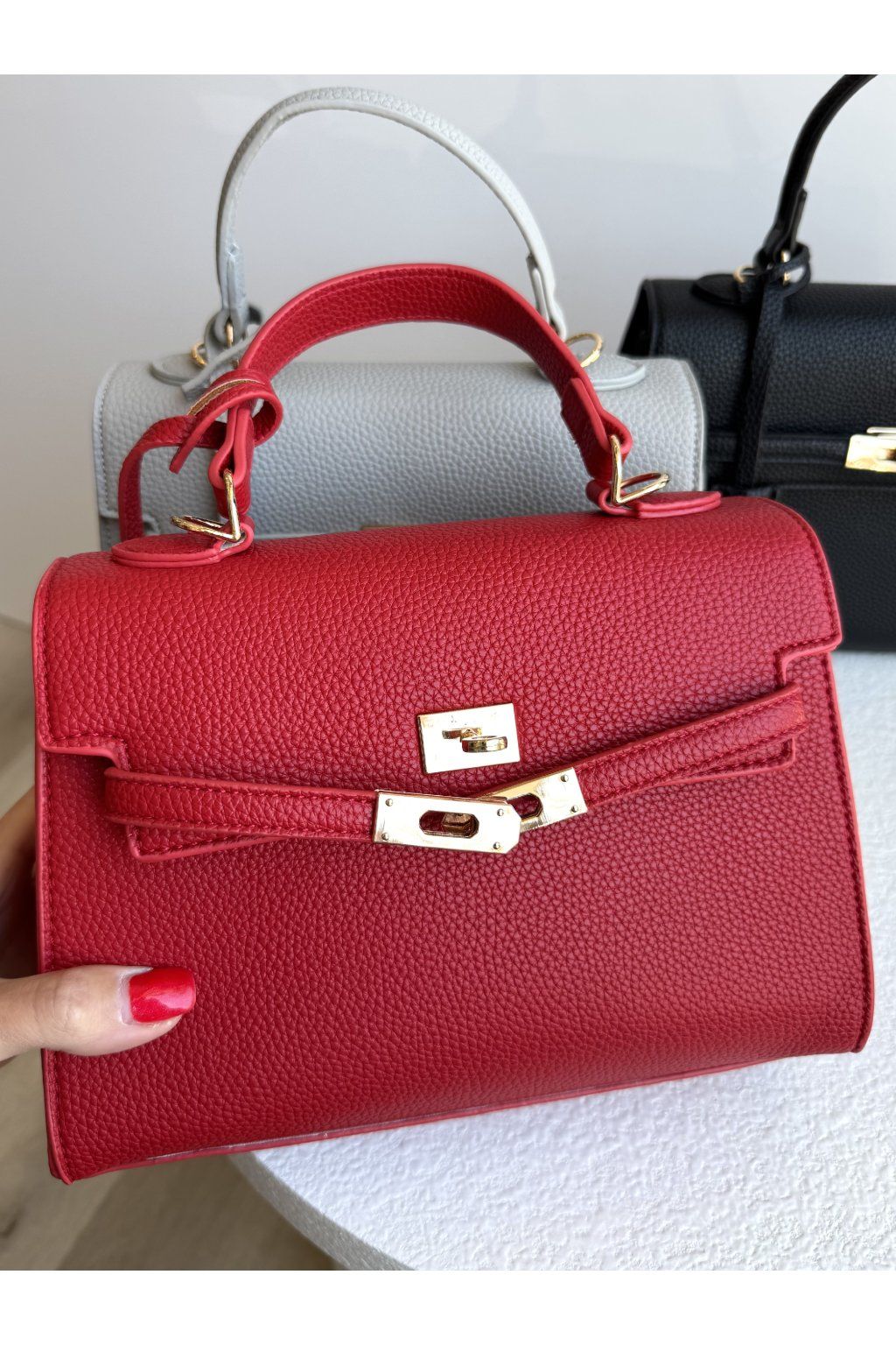 Kabelka s pevnou konstrukcí a strukturovanou povrchovou úpravou. Má klopové zapínání doplněné kovovým otočným zámkem ve zlatém tónu, který tvoří dominantní prvek přední části. Horní madlo je pevné a tvarované, uchycené pomocí kovových detailů. Kabelka má nastavitelný popruh v barvě kabelky.