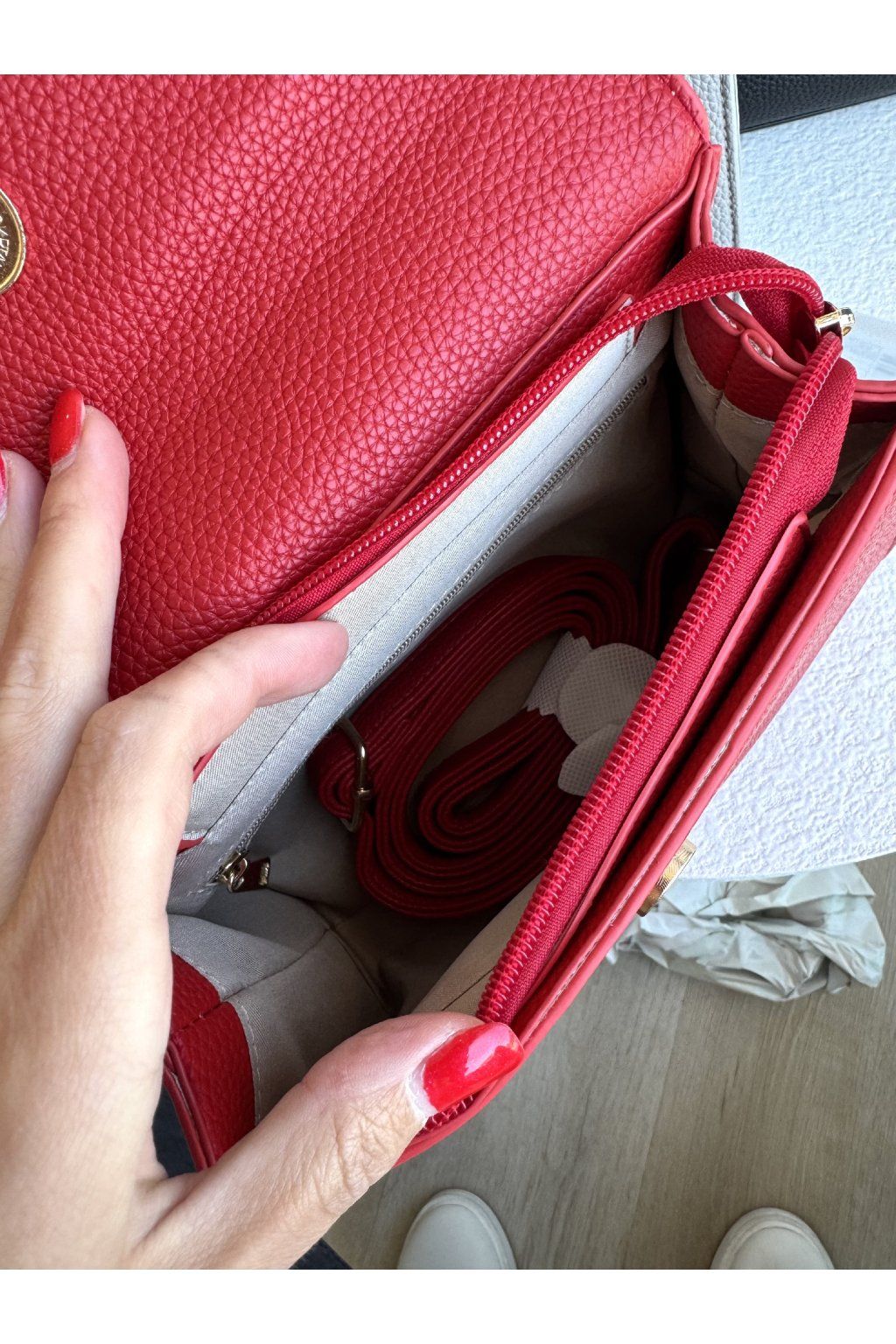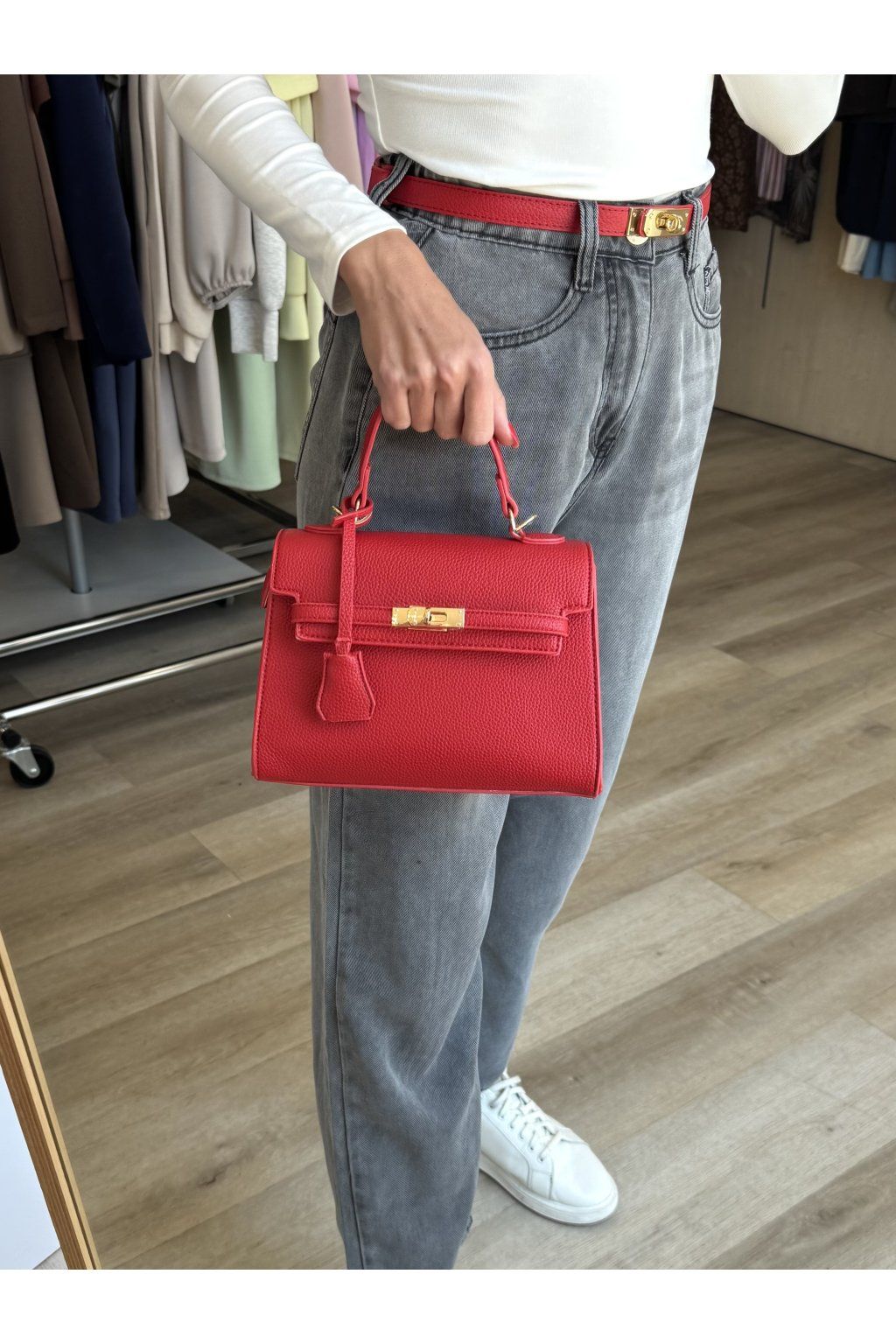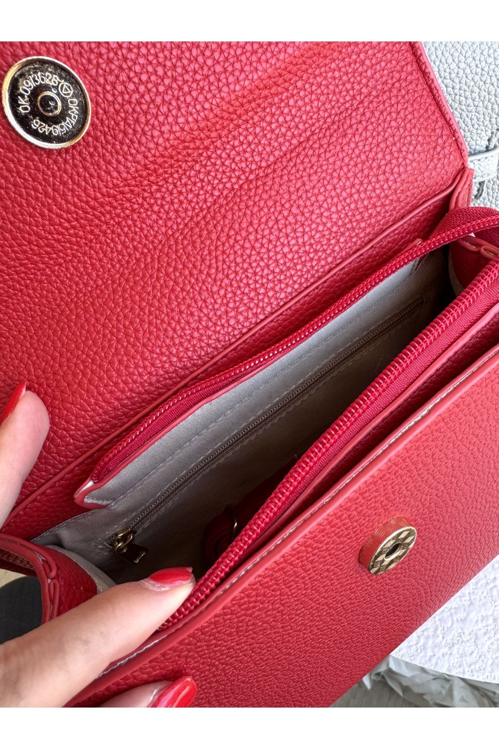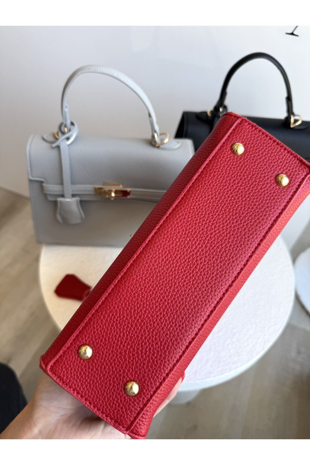 Kabelka s pevnou konstrukcí a strukturovanou povrchovou úpravou. Má klopové zapínání doplněné kovovým otočným zámkem ve zlatém tónu, který tvoří dominantní prvek přední části. Horní madlo je pevné a tvarované, uchycené pomocí kovových detailů. Kabelka má nastavitelný popruh v barvě kabelky.