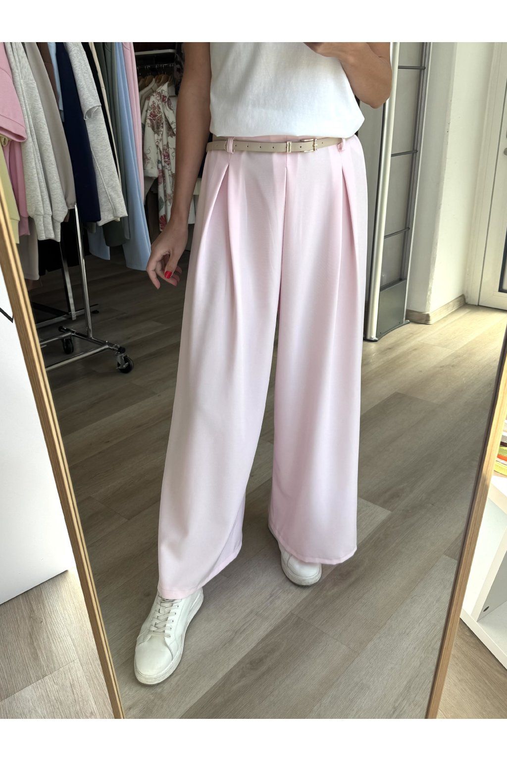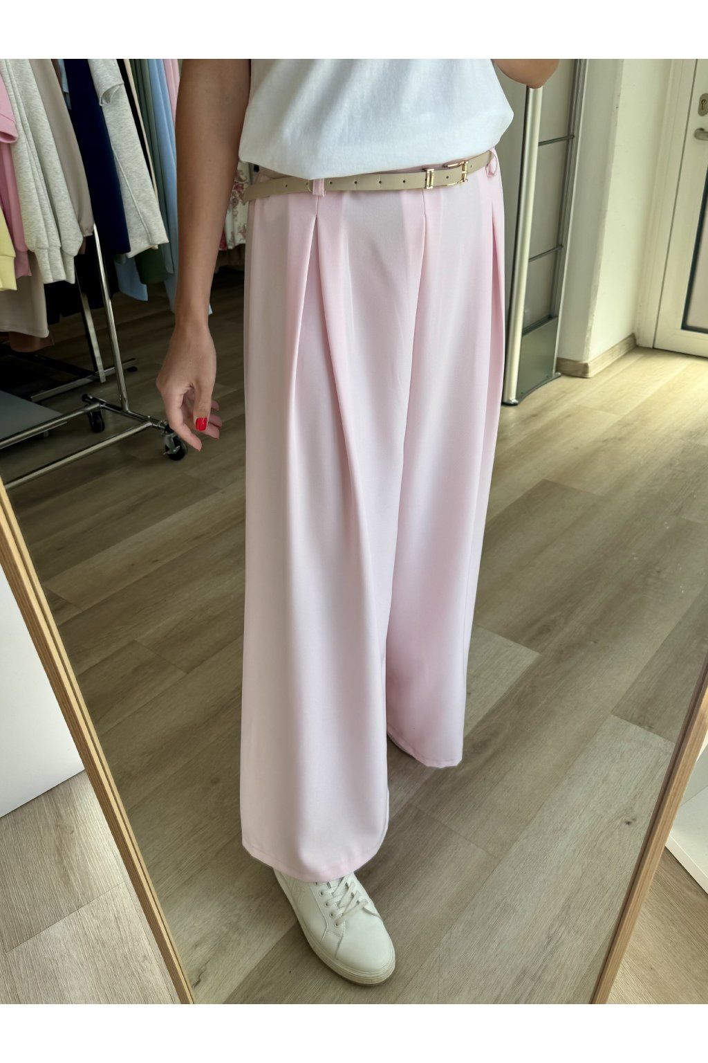 Elegantní kalhoty v jemných pastelových odstínech se vzdušným střihem. Mají pohodlný pružný pas doplněný páskem, který zvýrazní siluetu. Nahoře jsou jemné sklady, které dodávají kalhotám elegantní vzhled. Doporučujeme od velikost S do M.