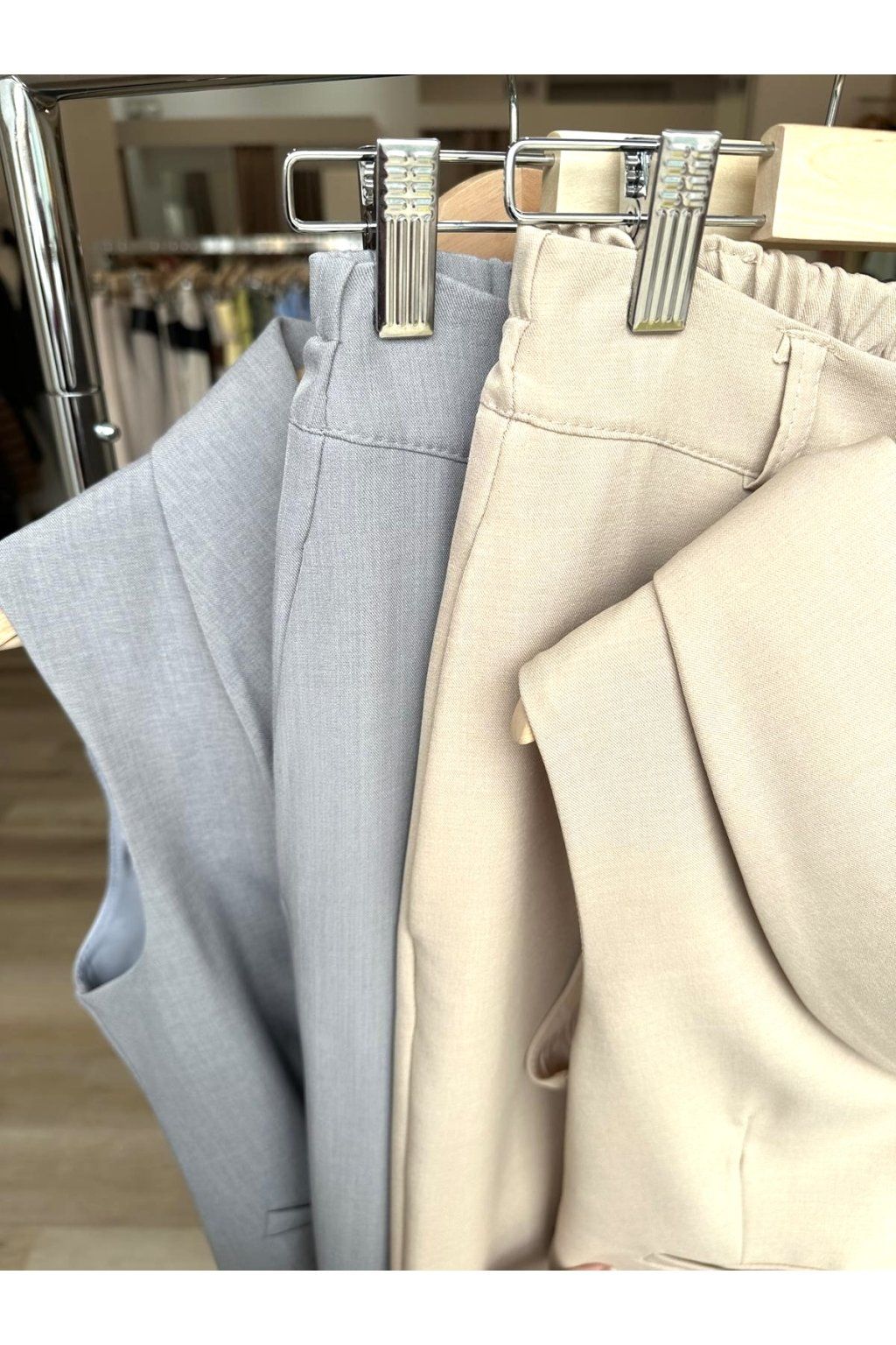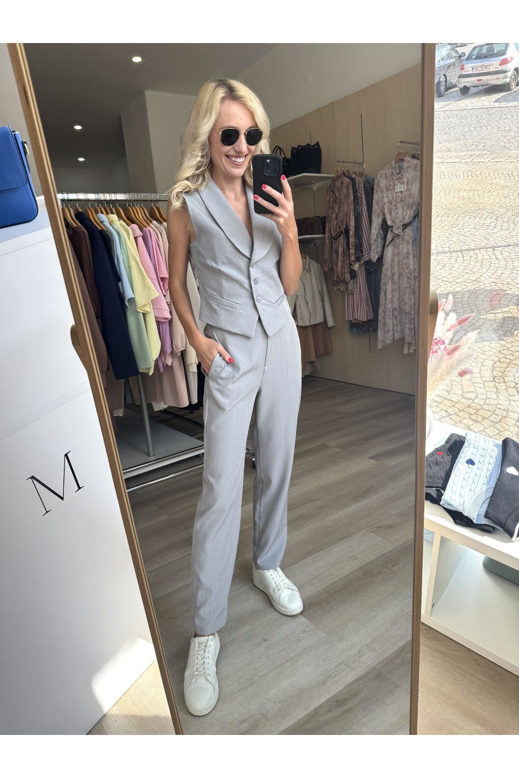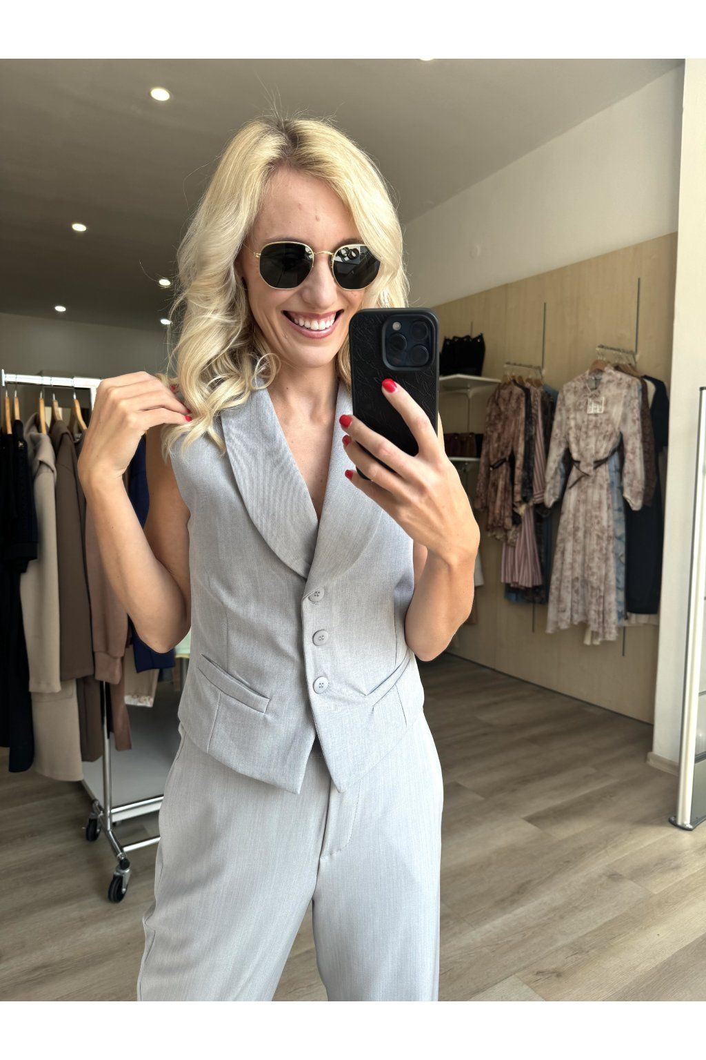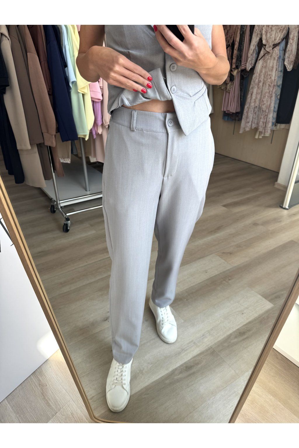 Elegantní komplet tvořený vestou bez rukávů a úzkými cigaretovými kalhotami. Vesta s hlubším výstřihem, knoflíkovým zapínáním a zvýrazněným pasem krásně tvaruje siluetu, zatímco kalhoty s čistou linií a úzkými nohavicemi opticky prodlužují nohy.