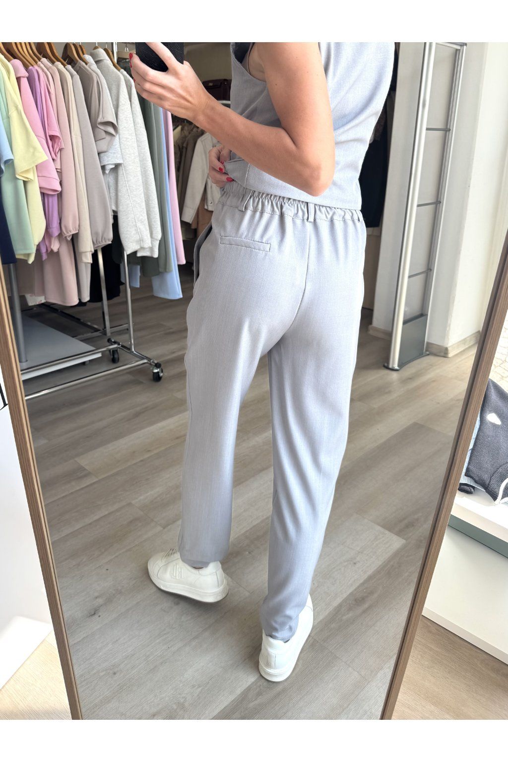 Střih: vesta bez rukávů, projmutý pas, zapínání na knoflíky, cigaretové kalhoty, vzadu na gumu
