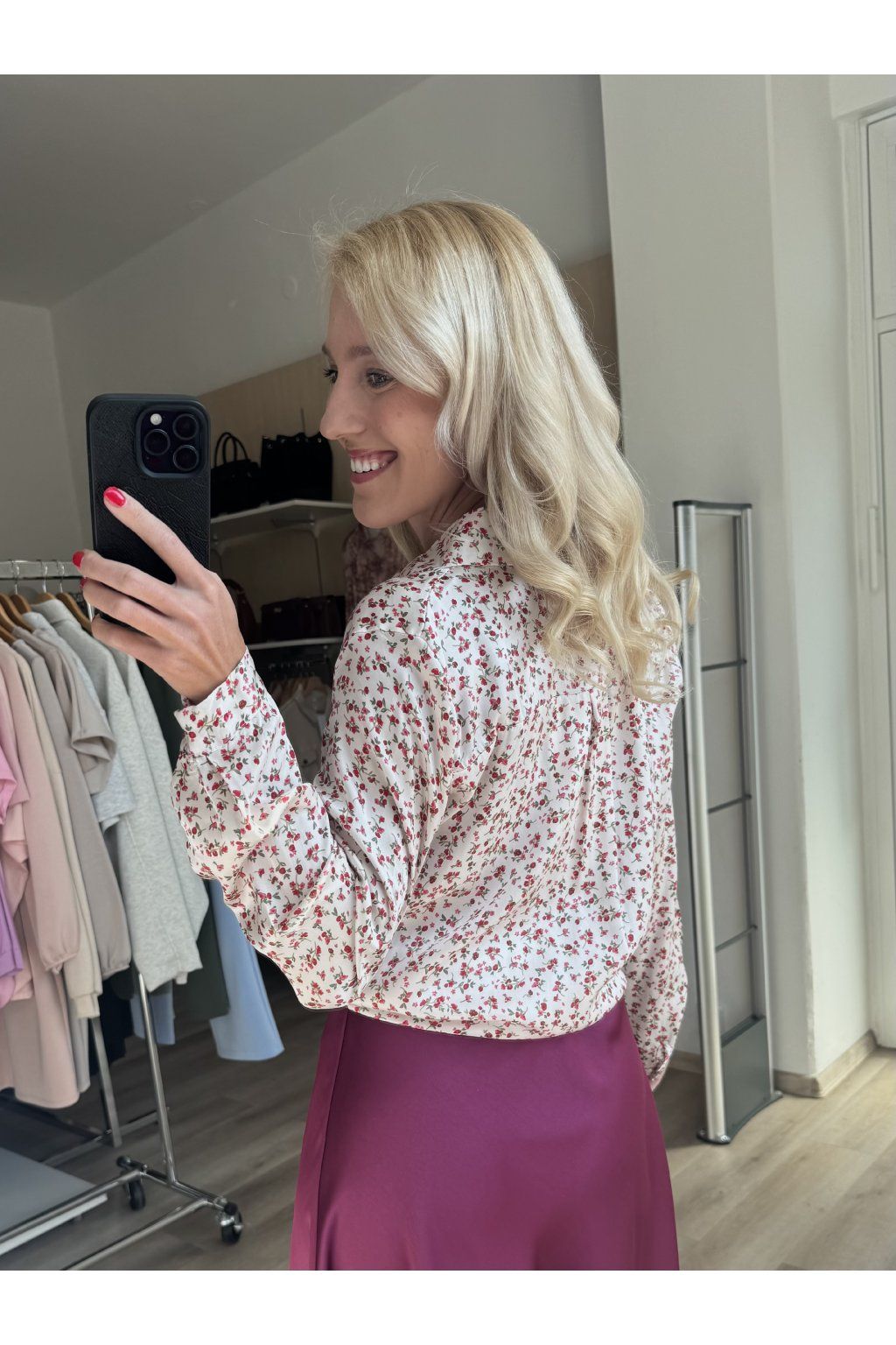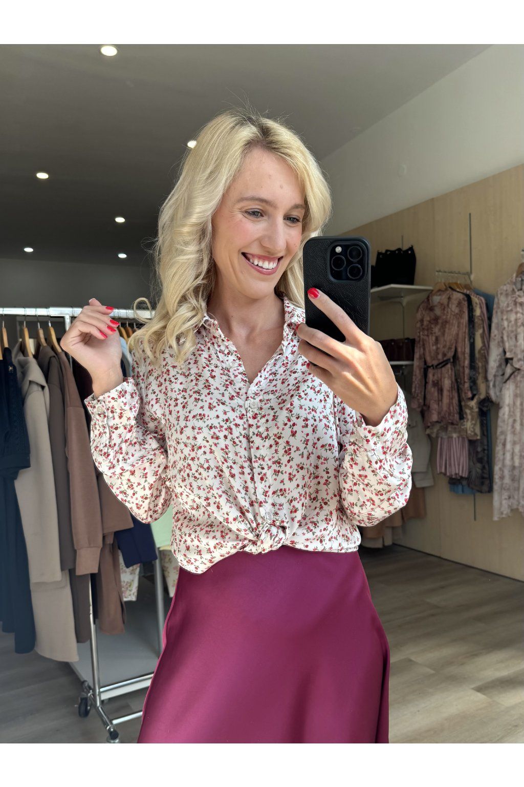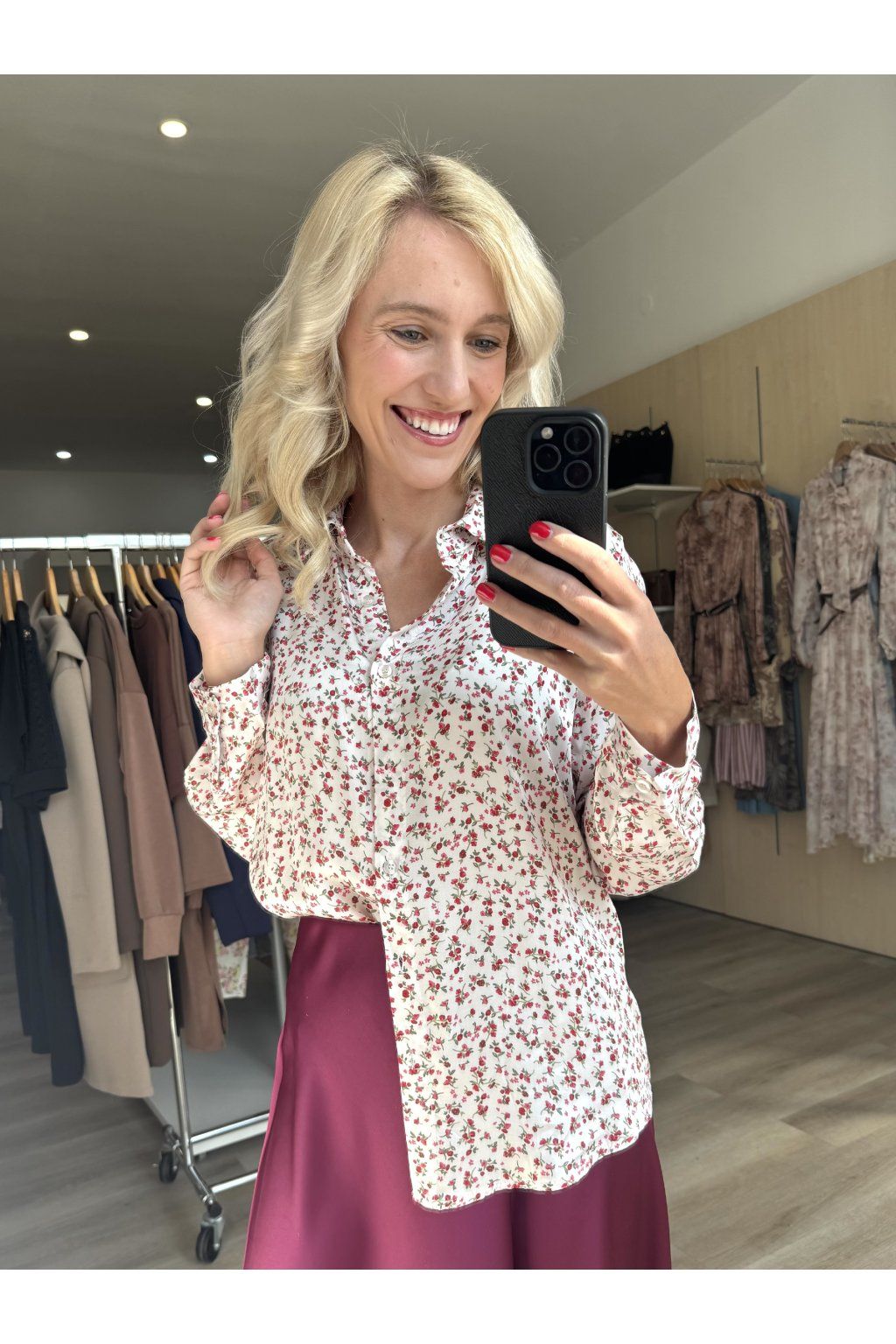 Košile v krémovém odstínu s jemným květinovým vzorem v červených tónech, který působí romanticky a svěže. Volnější střih s límečkem a zapínáním na knoflíky doplňují dlouhé rukávy zakončené manžetou. Doporučujeme od velikosti XS až M.
