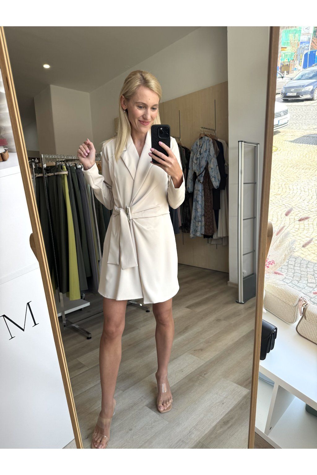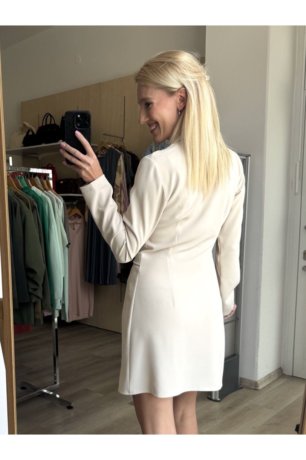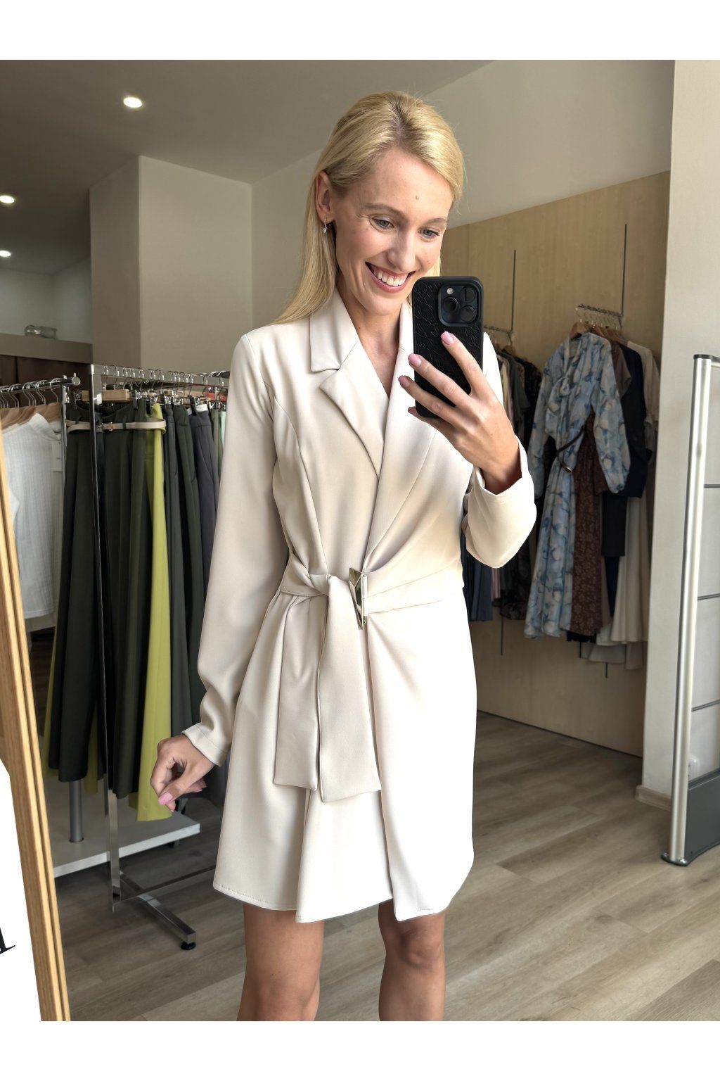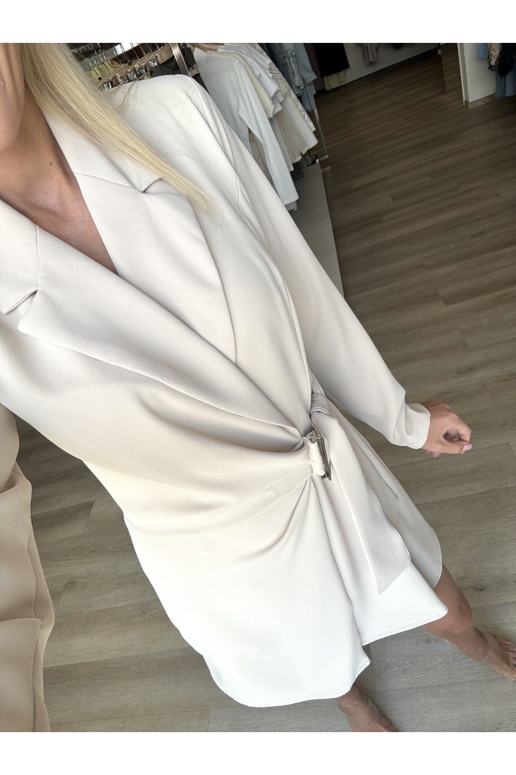 Elegantní šaty v jemném béžovém odstínu s jednoduchým, ale výrazným střihem. Mají hlubší výstřih do „V“ a límeček, který dodává lehce košilový vzhled. V přední části zaujmou zajímavým řasením a ozdobnou stříbrnou sponou, který vytváří jemný uzel a hezky tvaruje postavu.