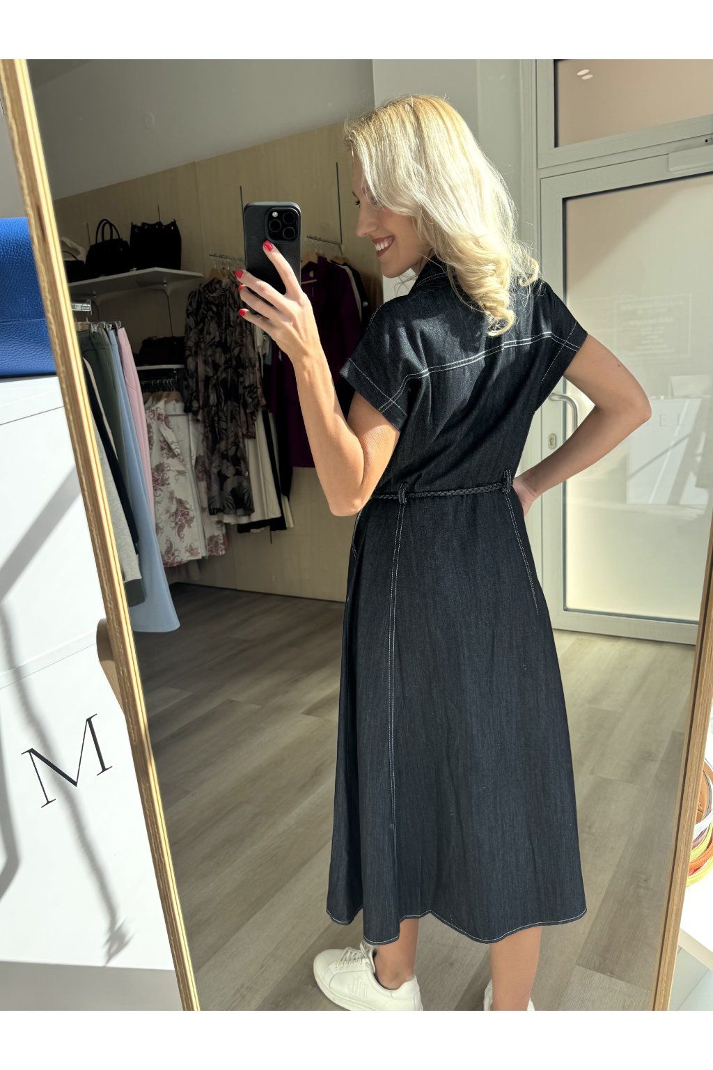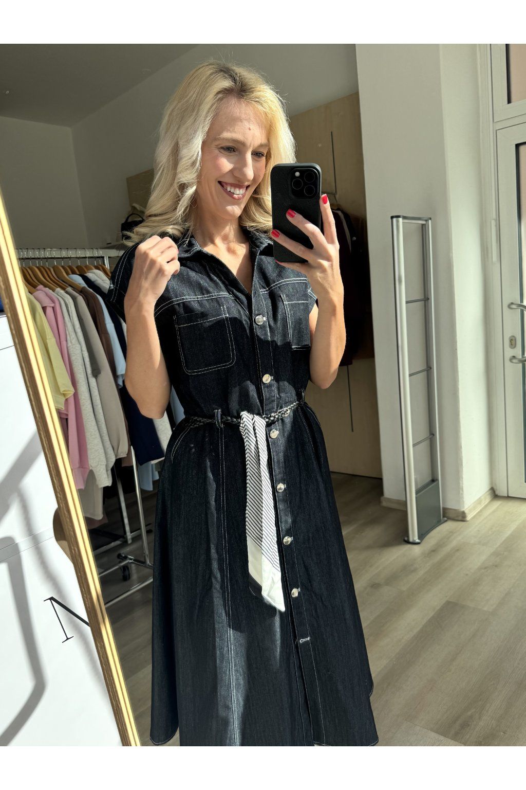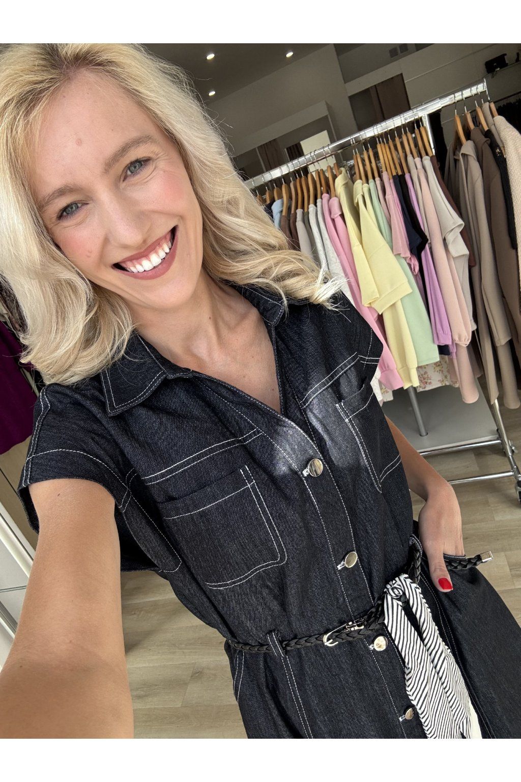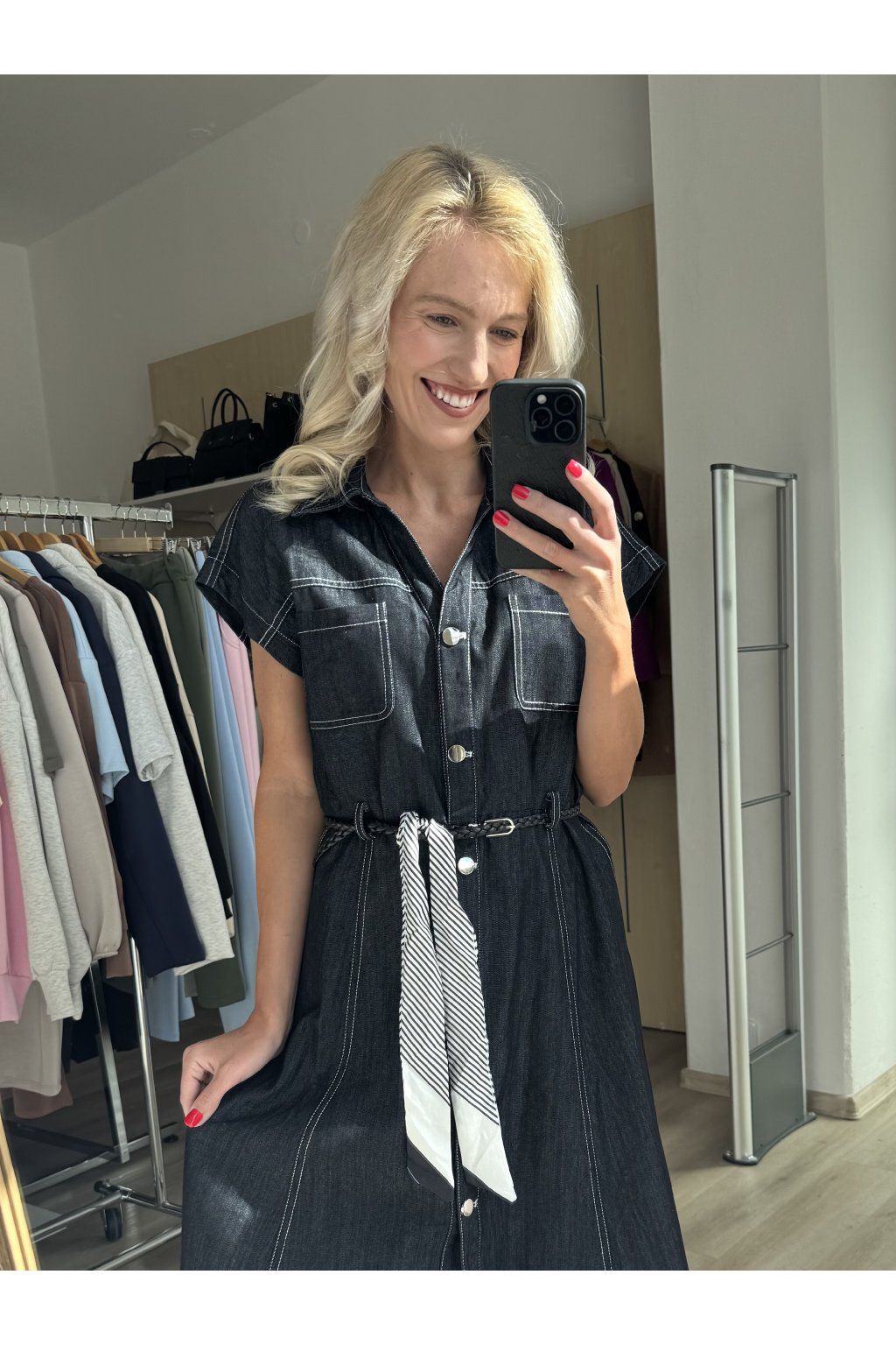 Dlouhé denimové šaty bez rukávů s kontrastním prošíváním, náprsními kapsami a zapínáním na knoflíky. Volnější áčkový střih doplněný koženkovým páskem zvýrazní siluetu. Sedí od velikosti S až do L.