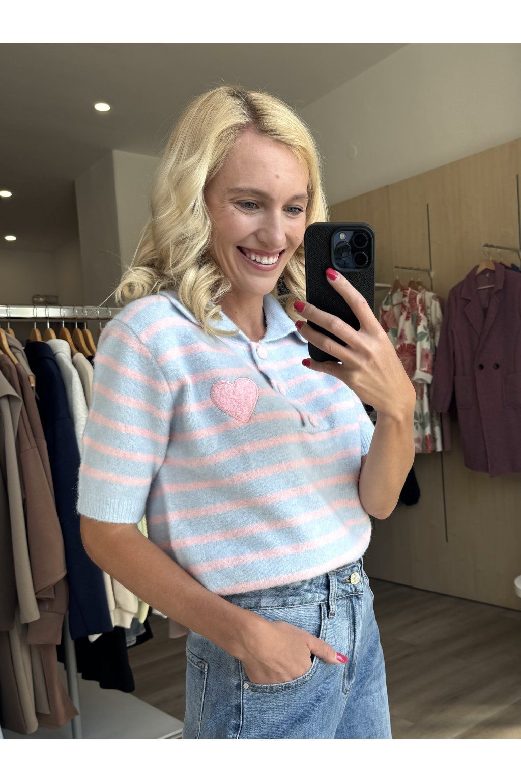 Svetřík s jemnými proužky a roztomilým srdíčkem na hrudi. Krátké rukávy, límeček na knoflíkové zapínání. Skvěle se hodí k džínám i sukním pro každodenní outfit.
