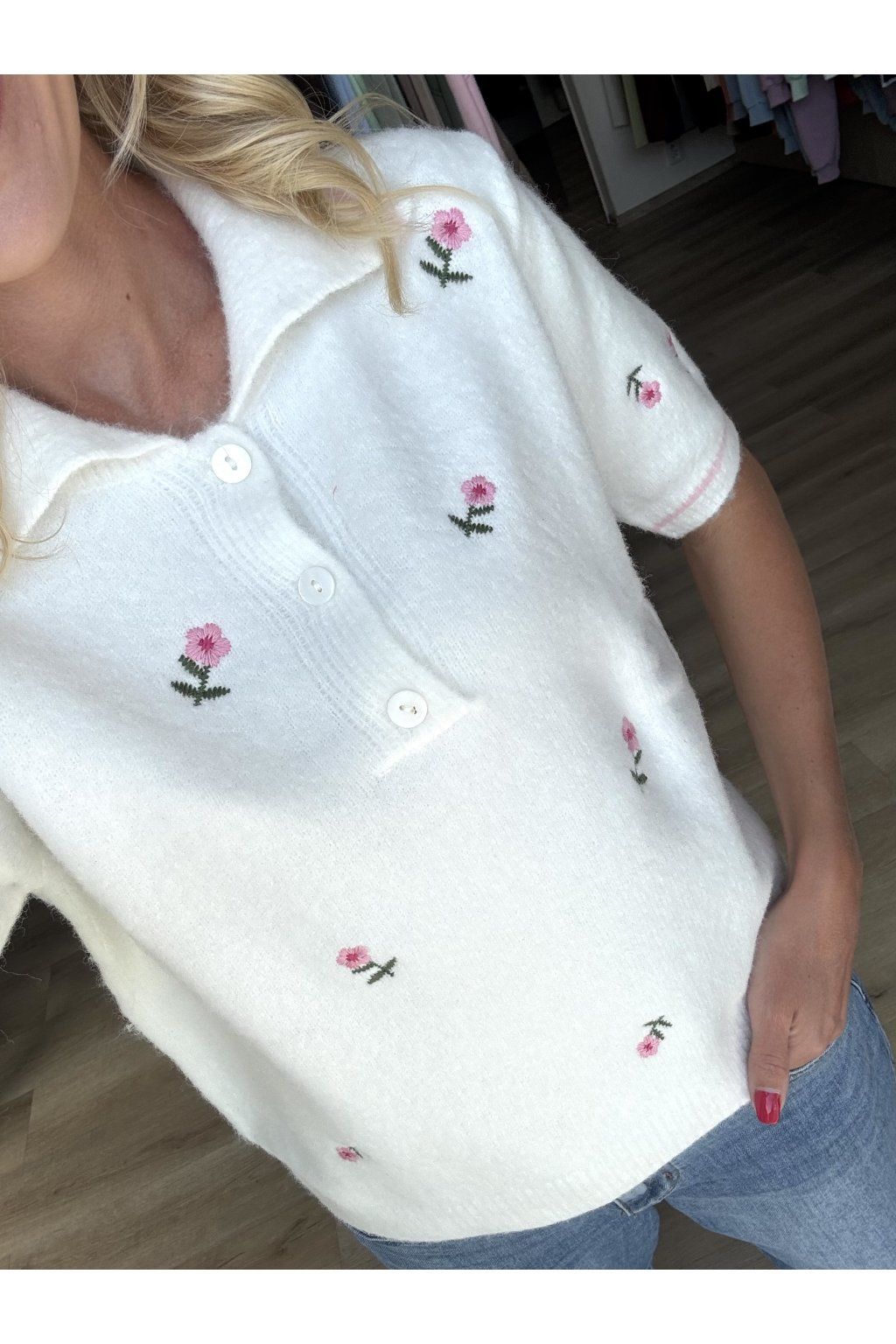 Jemný svetřík s límečkem, zdobený roztomilými květinovými výšivkami a růžovým lemováním okolo límce a rukávů. Zapínání na knoflíky.