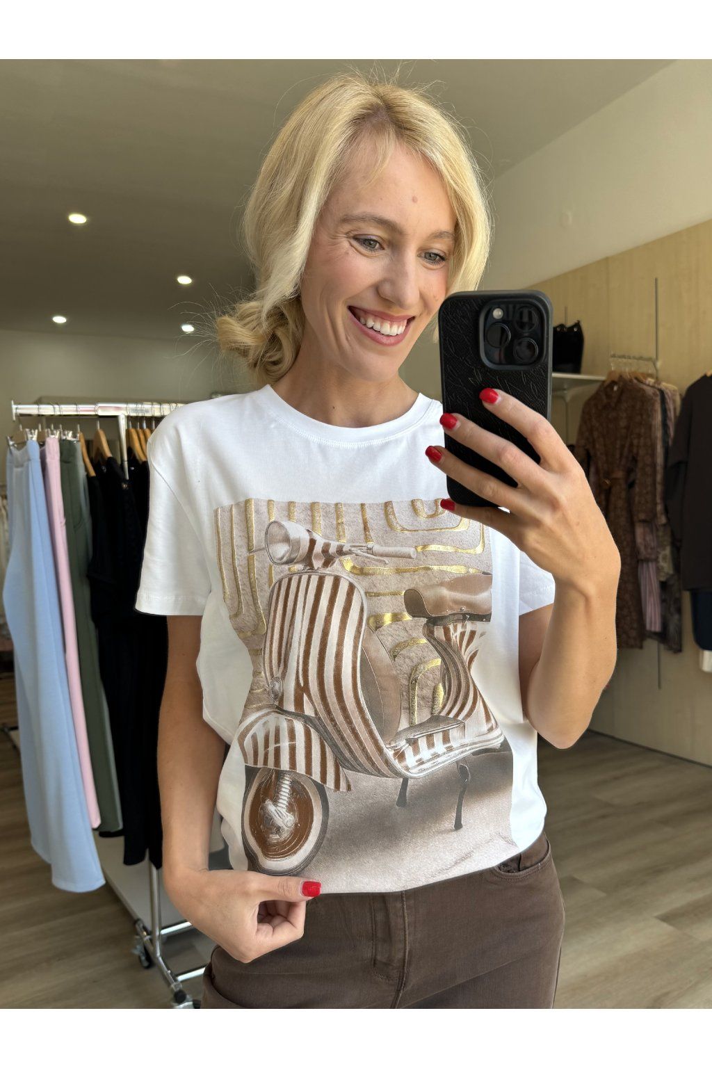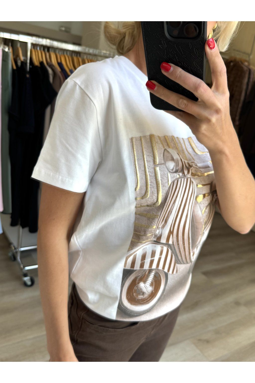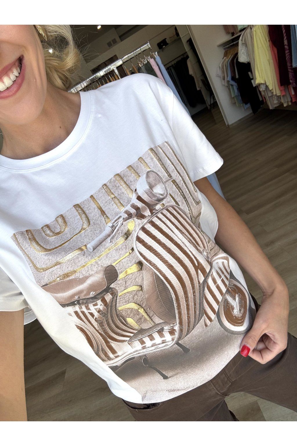 Tričko v bílé barvě s krátkým rukávem a kulatým výstřihem. Na přední straně je výrazný potisk skútru v hnědo-zlatých tónech, doplněný o lesklé detaily a grafický podklad, který vytváří zajímavý kontrast. Velikost je univerzální, doporučujeme od velikosti S až L.