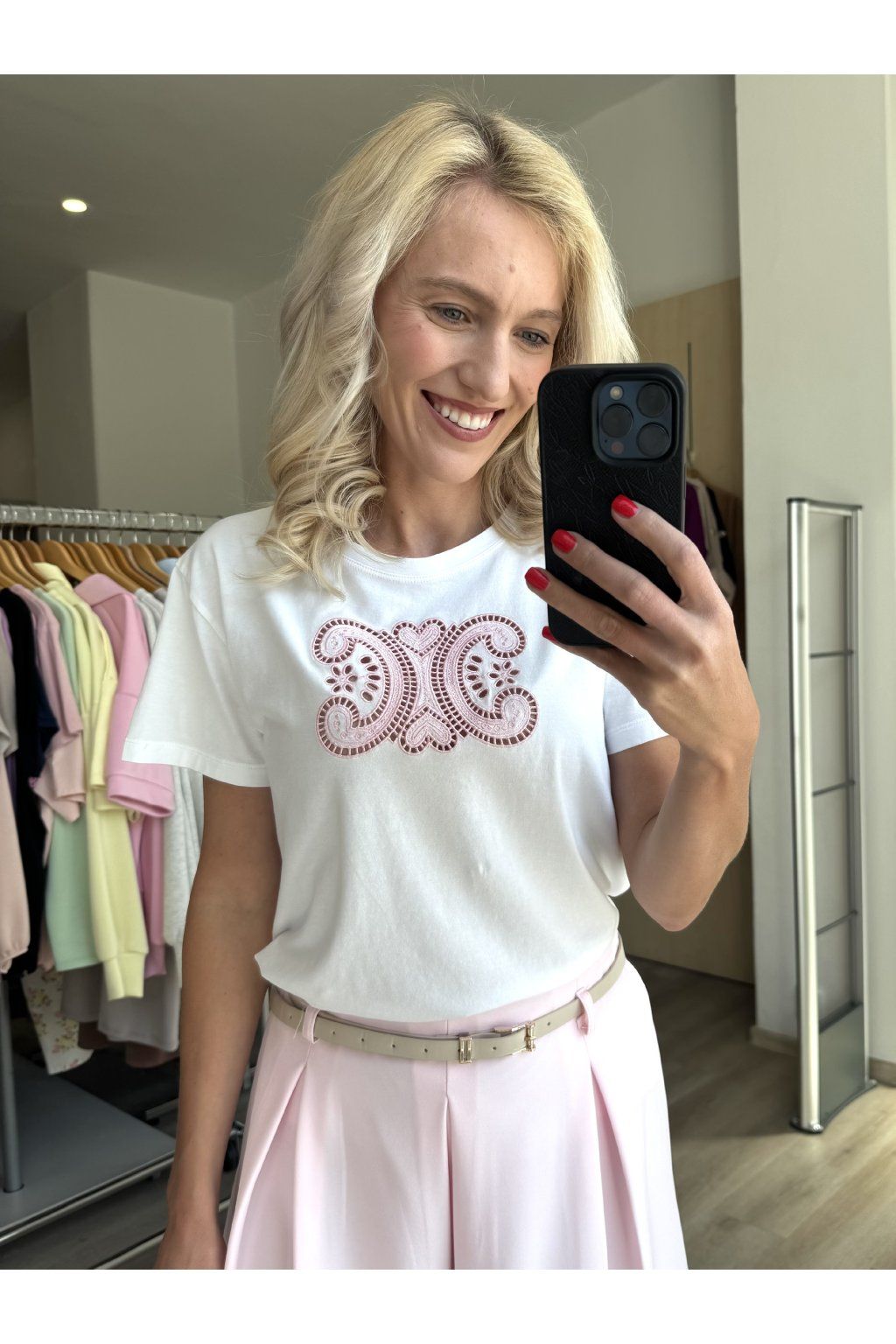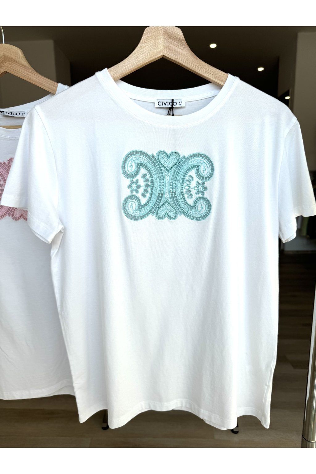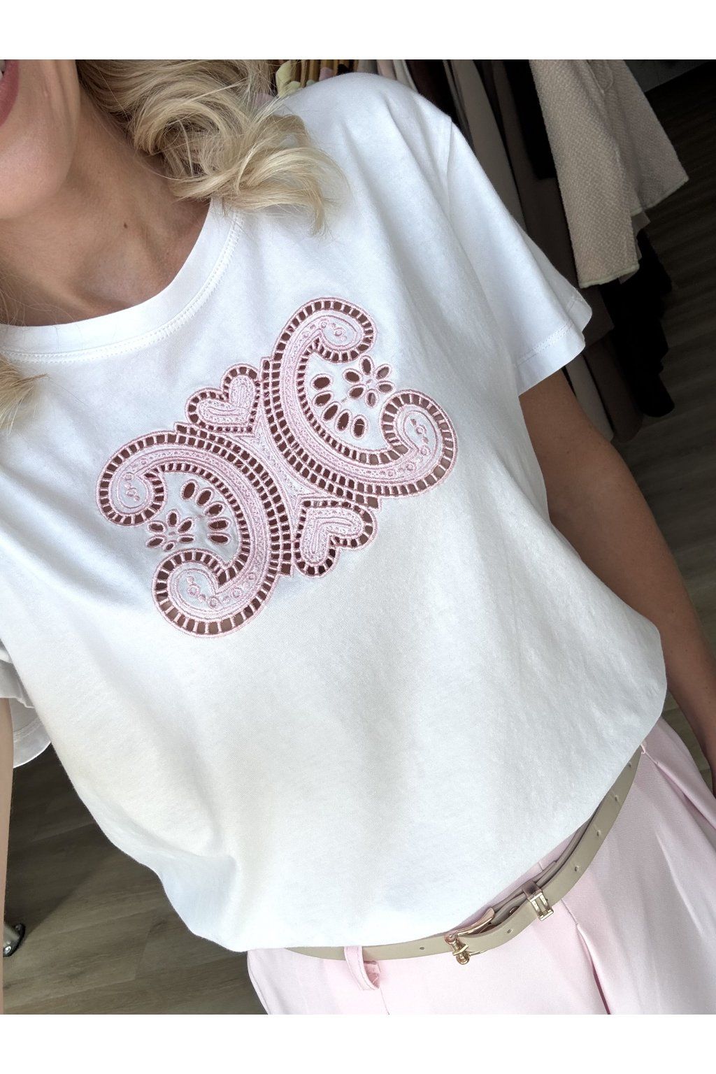 Tričko s krátkým rukávem, kulatým výstřihem a vyšívanou aplikací. Příjemný materiál, čistý bílý vzhled. Sedne od velikosti XS-M.