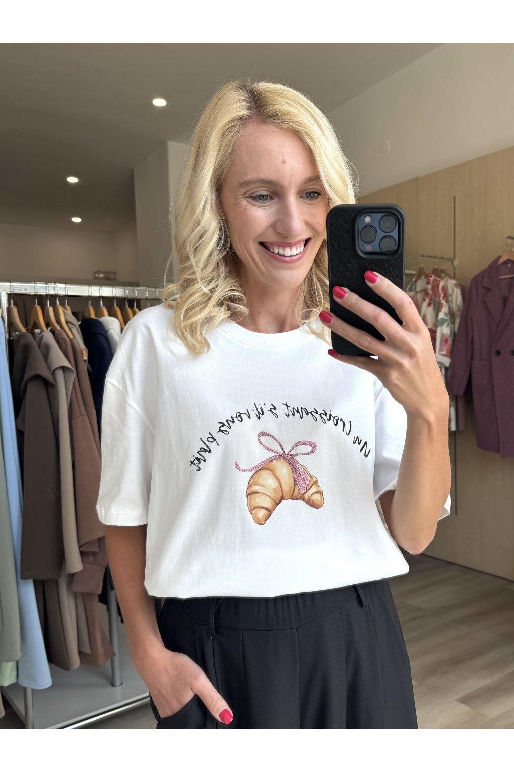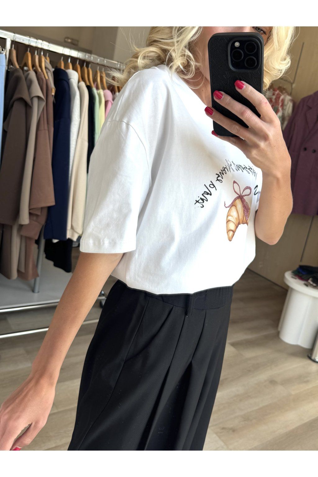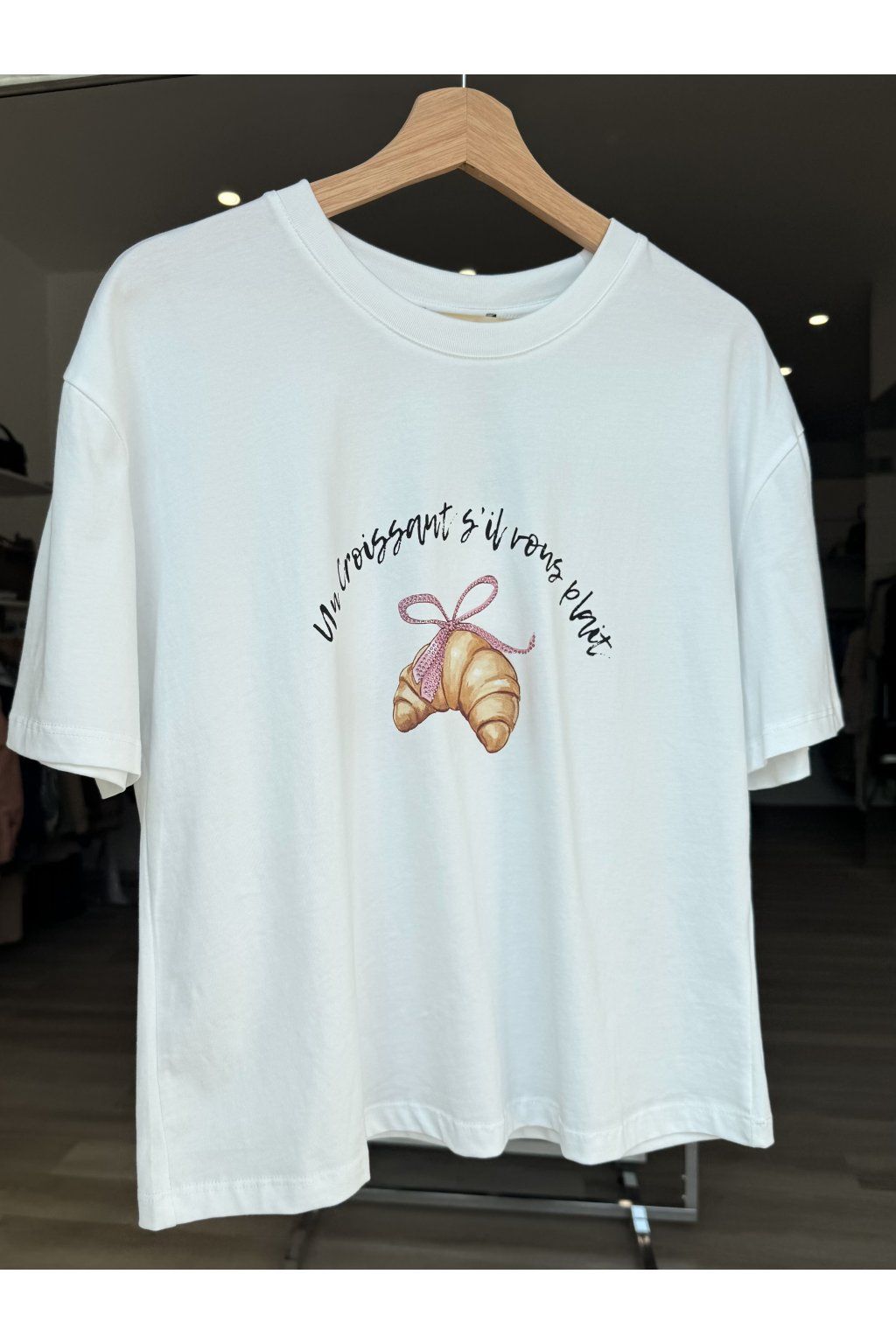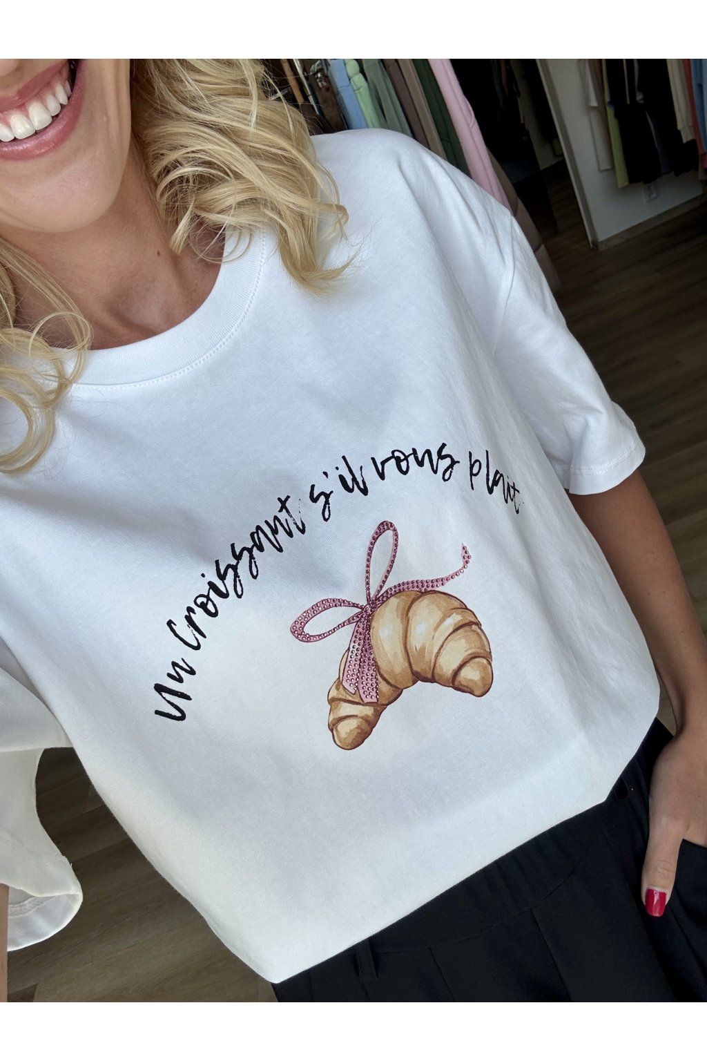 Tričko s krátkým rukávem a aplikací croissantu s růžovými kamínky. Příjemný materiál, čistý bílý vzhled.
